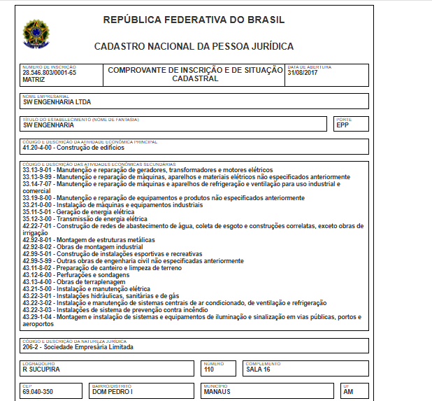 A empresa com a razão social Sw Engenharia Ltda, tem o nome fantasia Sw Engenharia, opera com o CNPJ 28.546.803/0001-65 e foi fundada em 2017. O endereço de sua sede está localizada na Rua Sucupira, 110 – Dom Pedro I, Manaus. Sua atividade principal é de Construção de edifícios.