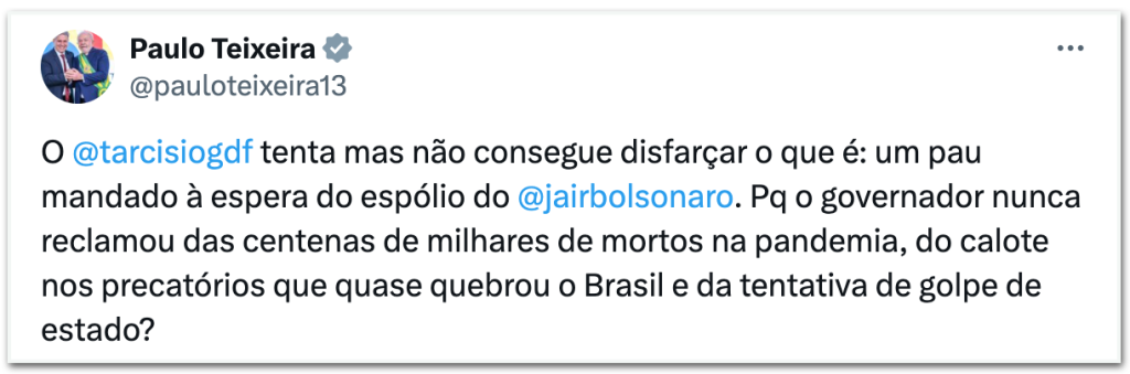 Em reação às críticas da gestão Lula, o ministro do Desenvolvimento Agrário e Agricultura Familiar, Paulo Teixeira, classificou o governador Tarcísio de Freitas como um “pau mandado” e afirmou que ele aguarda o “legado político” do ex-presidente Jair Bolsonaro (PL).