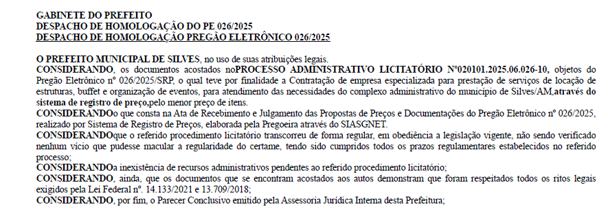 De acordo com o extrato publicado no Diário Oficial dos Municípios (DOM), mostra que o Pregão Eletrônico nº 026/2025, na modalidade de Sistema de Registro de Preços. Confira o documento.