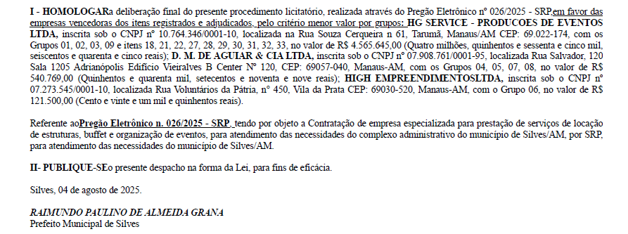 O documento aponta que três empresas foram contratadas, sendo a HG SERVICE PRODUÇÕES DE EVENTOS LTDA pelo total de R$ 4.565.645,00 (Quatro milhões, quinhentos e sessenta e cinco mil, seiscentos e quarenta e cinco reais). A empresa D. M. DE AGUIAR & CIA LTDA, vai receber R$ 540.769,00 (Quinhentos e quarenta mil, setecentos e sessenta e nove mil reais) por alguns itens. Já a empresa HIGTH EMPREENDIMENTOS LTDA vai ganhar R$ 121.500,00 (Centro e vinte e um mil e quinhentos reais), da Prefeitura de Silves.
