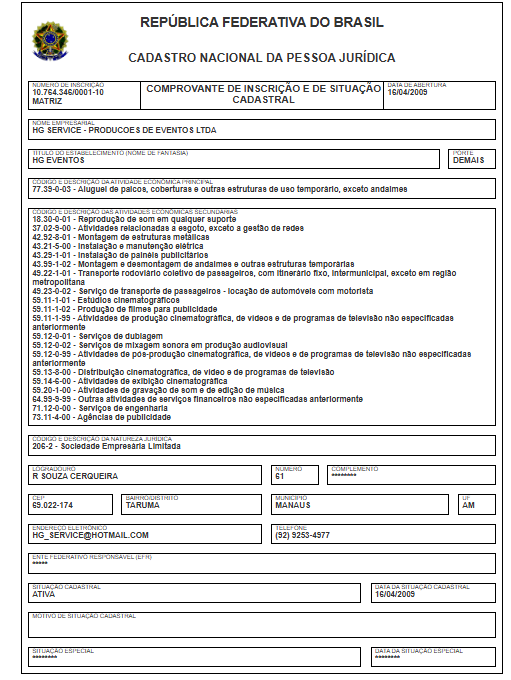 A empresa com a razão social Hg Service – Producoes de Eventos Ltda, tem o nome fantasia Hg Eventos e opera com o CNPJ 10.764.346/0001-10. O endereço de sua sede está localizada na Rua Souza Cerqueira, 61 – Tarumã, Manaus. Sua atividade principal é de Aluguel de palcos, coberturas e outras estruturas de uso temporário, exceto andaimes.