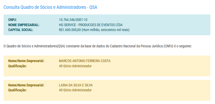 A empresa tem capital social de R$ 1,6 milhão e pertence a Marcos Antônio Costa e Laina Da Silva.