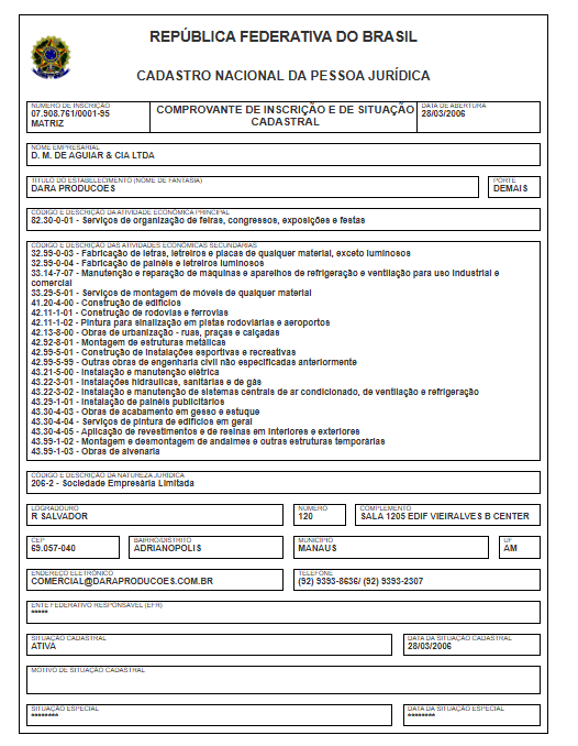 A empresa com a razão social D. M. de Aguiar & Cia Ltda, tem o nome fantasia Dara Produções e opera com o CNPJ 07.908.761/0001-95. O endereço de sua sede está localizada na Rua Salvador, 120 – Adrianópolis, Manaus. Sua atividade principal é de Serviços de organização de feiras, congressos, exposições e festas.
