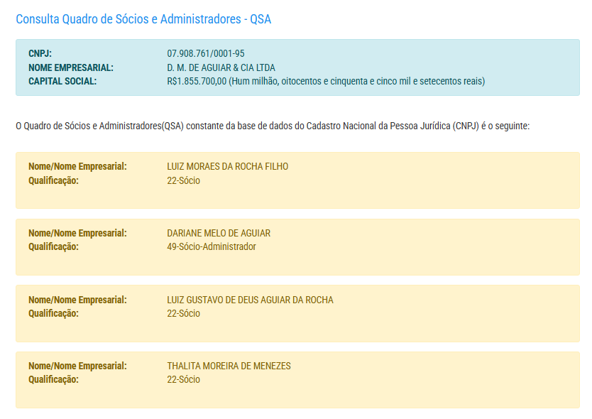 A empresa D.M de Aguiar possui capital social R$ 1.855.700,00 e pertence a um grupo de empresários Luiz Moraes da Rocha, Dariane Melo de Aguiar, Luiz Gustavo da Rocha e Thalita Moreira.