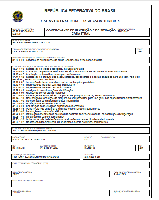 A empresa com a razão social High Empreendimentos Ltda, tem o nome fantasia High Empreendimentos e opera com o CNPJ 07.273.545/0001-10. O endereço de sua sede está localizada na Rua Voluntários da Pátria, 450 – Vila da Prata, Manaus. Sua atividade principal é de Serviços de organização de feiras, congressos, exposições e festas.