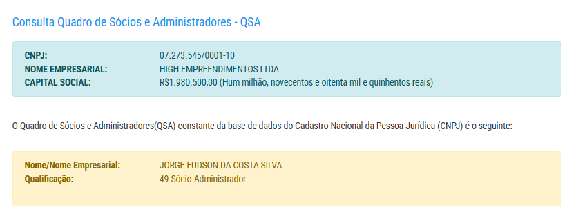 A empresa High Empreendimentos possui capital social de R$ 1.980.500,00 e pertence a José Eudson Silva.