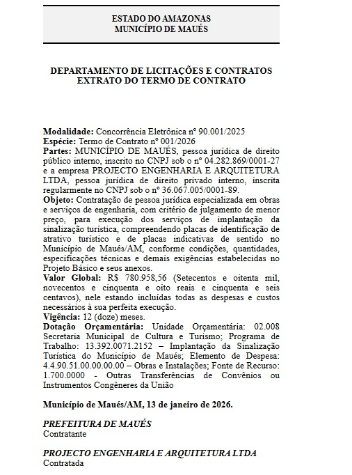 De acordo com o documento oficial, a Prefeitura de Maués, sob comando de Macelly Veras, contratou a empresa Projecto Engenharia e Arquitetura Ltda, inscrita no CNPJ nº 36.067.005/0001-89, por meio da Concorrência Eletrônica nº 90.001/2025, adotando o critério de julgamento de menor preço.