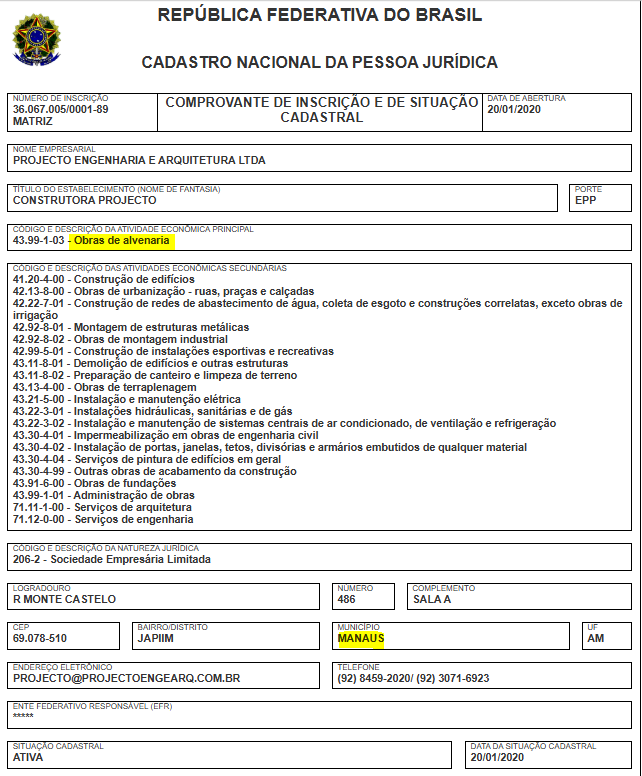 A empresa com a razão social Projecto Engenharia e Arquitetura Ltda, tem o nome fantasia Construtora Projecto, opera com CNPJ 36.067.005/0001-89 e foi fundada em 2020. O endereço de sua sede está localizada na Rua Monte Castelo, 486 – Japiim, Manaus. Sua atividade principal é de Obras de alvenaria.