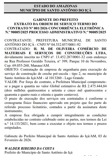 A Prefeitura de Santo Antônio do Içá, sob o comando do prefeito Walder Ribeiro da Costa, mais conhecido popularmente como Cecéu (MDB), oficializou a execução de um contrato milionário para a construção de uma creche pré-escolar, no município. O gasto, que chega a R$ 2.475.444,84, foi autorizado por meio do Extrato da Ordem de Serviço do Contrato nº 001/2026, decorrente da Concorrência Eletrônica nº 90005/2025.