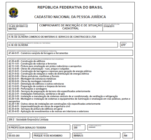 A empresa com a razão social H. M. de Oliveira Comercio de Matérias e Serviços de Construções Ltda, tem o nome fantasia Gh Comercio e Serviços de Matérias de Const. em Geral, opera com o CNPJ 13.452.287/0001-32 e foi fundada em 2011. O endereço de sua sede está localizada na Rua Professor Geraldo Teixeira, 399 – Parque 10 de Novembro, Manaus. Sua atividade principal é de Comércio varejista de ferragens e ferramentas.