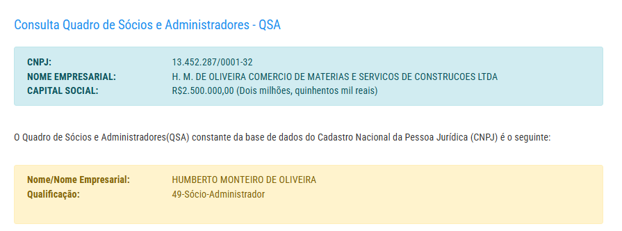 A empresa possui capital de R$ 2,5 milhões e pertence a Humberto Monteiro de Oliveira.