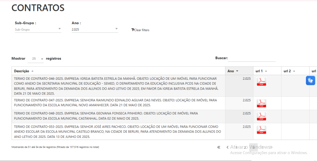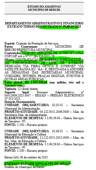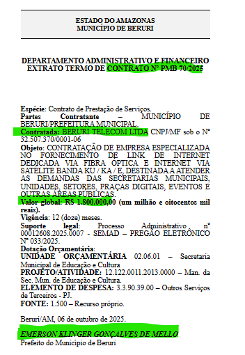 Os contratos, foram publicados no Diário Oficial dos Munícipios (DOM), e beneficiam duas empresas sendo uma de Manacapuru e outra do próprio município de Beruri. De acordo com os documentos divulgados, as contratas irão fornecer os mesmos serviços: “Fornecimento de link de internet dedicada via fibra óptica e internet via satélite banda ku/ ka/ e, destinada a atender as demandas das secretarias municipais, unidades, setores, praças digitais, eventos e outras áreas públicas”.