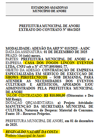 O extrato do contrato foi publicado na última sexta-feira (5), no Diário Oficial dos Municípios do Amazonas (DOM). De acordo com o documento, o município aderiu à Ata de Registro de Preço (ARP) nº 015/2025 para contratar a empresa Casa dos Fogos Lincon Eventos Ltda, pelo valor global de R$ 810.000,00 (Oitocentos e dez mil reais).