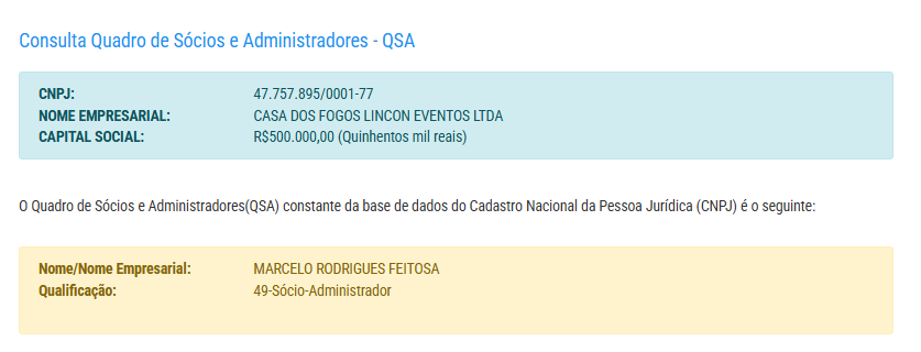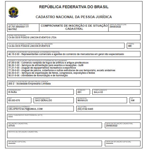 A empresa com a razão social Casa dos Fogos Lincon Eventos Ltda, tem o nome fantasia Casa dos Fogos Lincon Eventos, opera com o CNPJ 47.757.895/0001-77 e foi fundada em 2022. O endereço de sua sede está localizada na Rua Para, 891 – São Geraldo, Manaus. Sua atividade principal é de Representantes comerciais e agentes do comércio de mercadorias em geral não especializado.