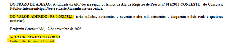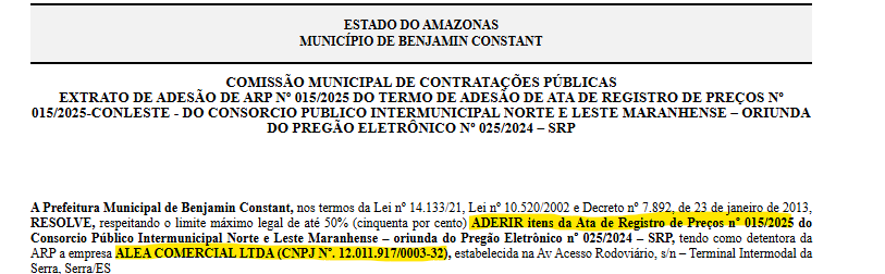 De acordo com o documento, a Prefeitura de Benjamin Constant aderiu à Ata de Registro de Preços n° 015/2025, do Consórcio Público Intermunicipal Norte e Leste Maranhense, – oriunda do Pregão Eletrônico nº 025/2024 – SRP.