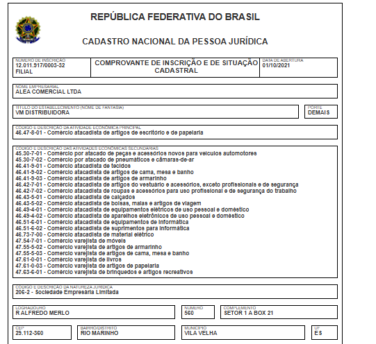A empresa com a razão social Alea Comercial Ltda, tem o nome fantasia Vm Distribuidora, opera com o CNPJ 12.011.917/0003-32 e foi fundada em 01/10/2021. O endereço de sua sede está localizada na Rua Alfredo Merlo, 560 – Rio Marinho, Vila Velha – ES, 29.112-360. Sua atividade principal é de Comércio atacadista de artigos de escritório e de papelaria.
