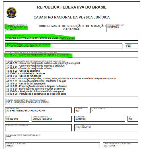 A empresa com a razão social Moraes e Cavalcante Materiais de Construção Ltda, tem o nome fantasia o Baratão da Construção, opera com o CNPJ 07.671.347/0001-05 e foi fundada em 08/11/2005. O endereço de sua sede está localizada na Avenida Brigadeiro Hilario Gurjão, 903 – Jorge Teixeira, Manaus. Sua atividade principal é de Comércio varejista de ferragens e ferramentas.