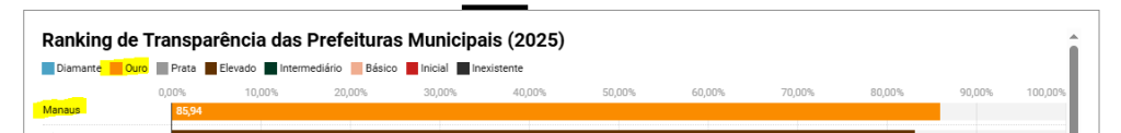 No topo do ranking está a Prefeitura de Manaus, que alcançou 85,95% de índice de transparência pública e recebeu classificação ouro, apontando um contraste com as prefeituras que figuram no fundo da tabela.