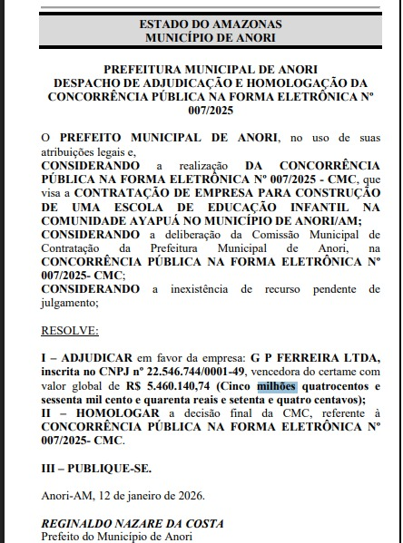 Com um simples despacho administrativo, o prefeito de Anori, Regis Nazaré (Republicanos), homologou a liberação de R$ 5.460.140,74 para a construção de uma escola de educação infantil na comunidade Ayapuá. O valor expressivo chama atenção não apenas pelo montante milionário, mas principalmente pela ausência de informações claras e detalhadas sobre como o dinheiro público será efetivamente utilizado.