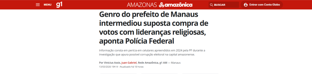 O prefeito de Manaus, David Almeida (Avante), pré-candidato a governador do Amazonas, se vê envolvido em uma polêmica neste fim de semana. Um laudo da Polícia Federal aponta que o genro dele, Gabriel Alexandre da Silva Lima, teria intermediado uma suposta compra de votos junto a lideranças religiosas nas eleições municipais de 2024.