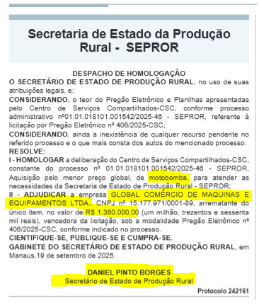 O Pregão Eletrônico n° 406/2025 homologado e adjudicado em favor da empresa Global Comércio de Máquinas e Equipamentos LTDA, foi disponibilizado no Diário Oficial do Estado (DOE), na última sexta-feira (19). O documento foi assinado pelo próprio secretário da Sepror.