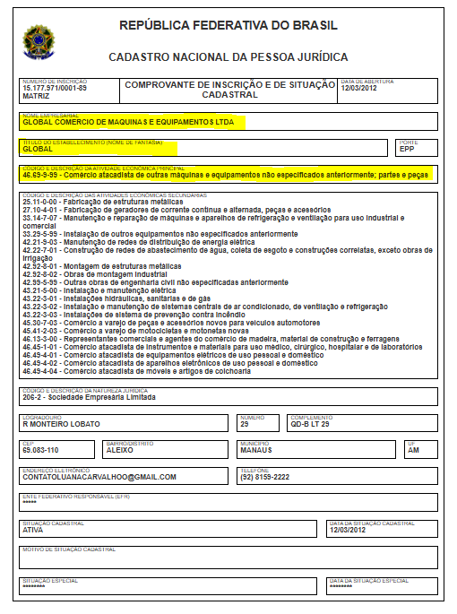 A empresa com a razão social Global Comercio de Maquinas e Equipamentos Ltda, tem o nome fantasia Global, opera com o CNPJ 15.177.971/0001-89. O endereço de sua sede está localizada na Rua Monteiro Lobato, 29 – Aleixo. Sua atividade principal é de Comércio atacadista de outras máquinas e equipamentos não especificados anteriormente; partes e peças.