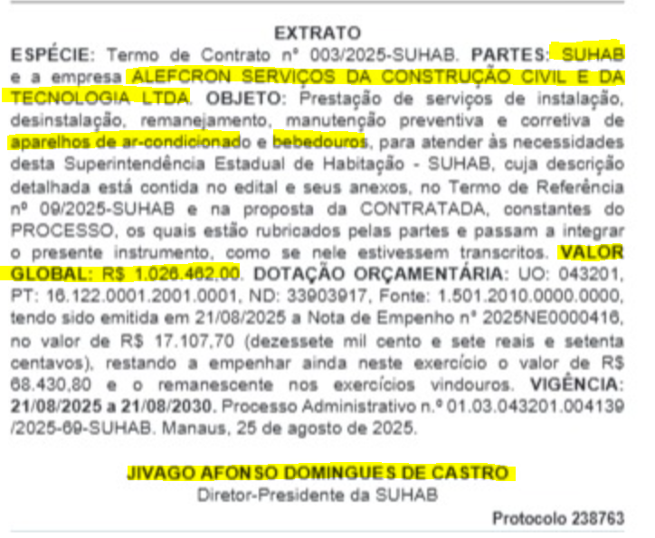 O documento publicado no Diário Oficial do Estado (DOE), torna público o gasto milionário da Superintendência em favor da empresa Alefcron Serviços da Construção Civil e da Tecnologia Ltda que foi vencedora do contrato n° 003/2025 e receberá dos cofres públicos do Amazonas o montante de R$ 1.026.462,00 (Um milhão, vinte e seis mil, quatrocentos e sessenta e dois reais).