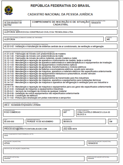 A empresa com a razão social Alefcron Servicos da Construcao Civil e da Tecnologia Ltda, tem o nome fantasia Alefcron, opera com o CNPJ 30.228.685/0001-99. O endereço de sua sede está localizada em Manaus. Sua atividade principal é de Instalação e manutenção de sistemas centrais de ar condicionado, de ventilação e refrigeração.