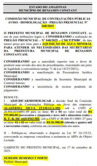 O documento publicado no Diário Oficial dos Municípios (DOM) nesta quarta-feira (24), informa que o Pregão Presencial n° 048/2025 que possui quatro itens, será de aquisição de água mineral para atender as secretarias de Benjamin Constant.