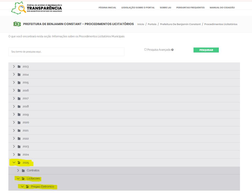 O site da Transparência da Prefeitura Municipal de Benjamin Constant, na aba de Licitações – Pregão Eletrônico 2025, não possui nenhuma informações documentais. O que causa certa estranheza na imprensa e na população, que questiona para onde a verba pública está sendo remanejada,
