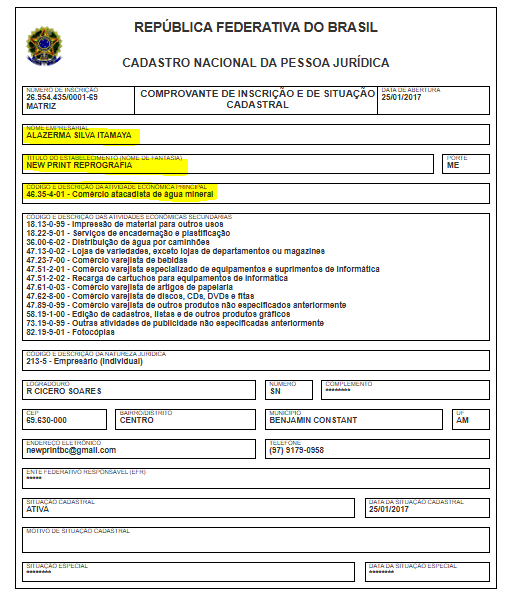 A empresa com a razão social Alazerma Silva Itamaya, tem o nome fantasia New Print Reprografia, opera com o CNPJ 26.954.435/0001-69 e foi fundada em 2017. O endereço de sua sede está localizada na Rua Cicero Soares – Centro, Benjamin Constant. Sua atividade principal é de Comércio atacadista de água mineral.