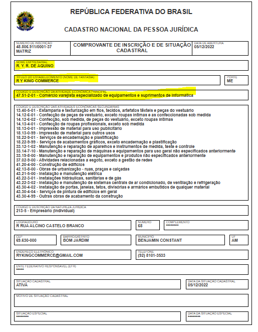 A segunda empresa com a razão social R. Y. R. de Aquino, tem o nome fantasia R Y King Commerce, opera com o CNPJ 48.806.911/0001-37 foi fundada em 2022. O endereço de sua sede está localizada na Rua Rua Alcino Castelo Branco, 68, Benjamin Constant. Sua atividade principal é de Comércio varejista especializado de equipamentos e suprimentos de informática.