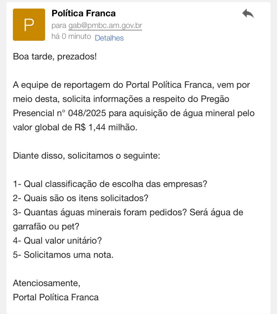 A equipe de reportagem do Política Franca, encaminhou uma solicitação de nota por e-mail para a prefeitura de Benjamin Constant questionando essa aquisição.