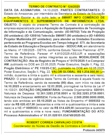 A Secretaria de Estado de Educação e Desporto Escolar (Seduc-AM), comandada pela secretária Arlete Mendonça vai torrar mais de R$ 1,2 milhão em: tela de projeção, televisão smart e projetor multimídia. O contrato n° 124/2025 foi firmado com a empresa Smart Info Comércio de Equipamentos e Suprimentos de Informática Ltda.