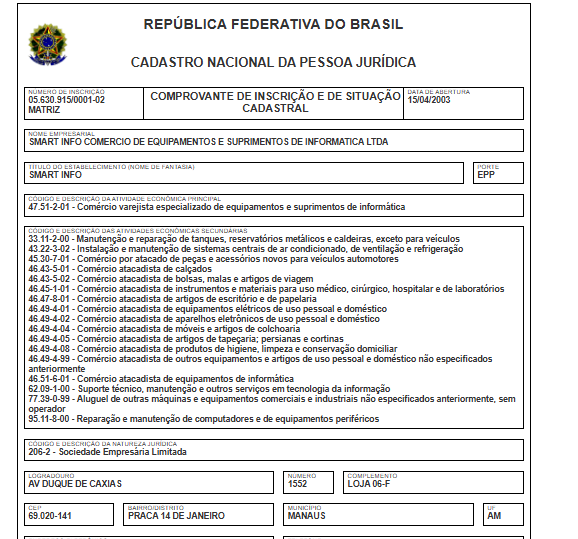 A empresa com a razão social Smart Info Comercio de Equipamentos e Suprimentos de Informática Ltda, tem o nome fantasia Smart Info, opera com o CNPJ 05.630.915/0001-02 e foi fundada em 15/04/2003. O endereço de sua sede está localizada na Avenida Duque de Caxias, 1552 – Praça 14 de Janeiro, Manaus. Sua atividade principal é de Comércio varejista especializado de equipamentos e suprimentos de informática, de acordo com dados da Receita Federal.