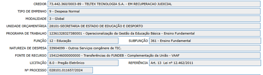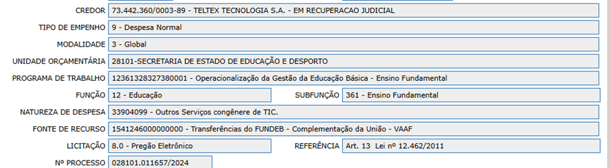 O que chama atenção é que a fonte dos recursos utilizados para pagar a empresa é o Fundo de Manutenção e Desenvolvimento da Educação Básica (FUNDEB), por meio da Complementação da União na modalidade VAAF (Valor Anual por Aluno – Fundo). Ou seja, trata-se de dinheiro destinado diretamente à melhoria da educação pública básica, o que torna ainda mais grave qualquer risco de má execução do contrato.