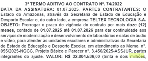 Entre 2022 e 2025, a empresa Teltex Tecnologia S.A, com sede em São Paulo, recebeu mais de R$ 72 milhões da Secretaria de Estado de Educação e Desporto Escolar do Amazonas (Seduc-AM), na gestão do governador Wilson Lima (União Brasil). O contrato tem como objetivo a implementação e manutenção de ambientes de áudio e vídeo, com fornecimento de equipamentos necessários à execução dos serviços.
