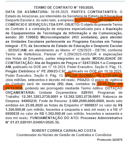 Desta vez, faltando um pouco mais de 2 meses, para encerrar o ano letivo dos alunos das escolas estaduais do Estado. A Seduc resolveu gastar R$ 2,7 milhões em microcomputadores na empresa Suprihouse Informática Comercio e Serviços Ltda através do contrato n° 105/2025.