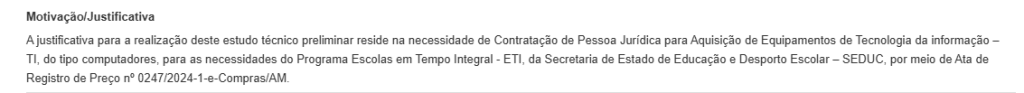 “A justificativa para a realização deste estudo técnico preliminar reside na necessidade de Contratação de Pessoa Jurídica para Aquisição de Equipamentos de Tecnologia da informação – TI, do tipo computadores, para as necessidades do Programa Escolas em Tempo Integral – ETI, da Secretaria de Estado de Educação e Desporto Escolar – SEDUC, por meio de Ata de Registro de Preço nº 0247/2024-1-e-Compras/AM”.