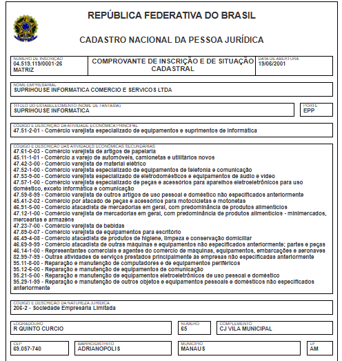 A empresa com a razão social Suprihouse Informática Comercio e Serviços Ltda, tem o nome fantasia Suprihouse Informática, opera com o CNPJ 04.519.119/0001-26 e foi fundada em 2001. O endereço de sua sede está localizada na Rua Quinto Curcio, 65 – Adrianópolis, Manaus. Sua atividade principal é de Comércio varejista especializado de equipamentos e suprimentos de informática.