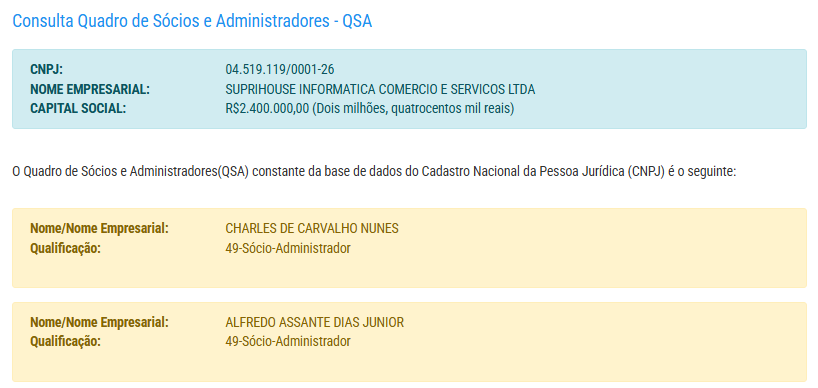 A empresa possui capital social de R$ 2,4 milhões e pertence a Charles de Carvalho Nunes e Alfredo Assante Dias Junior.