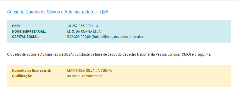 A empresa possui capital social de R$ 2,3 milhões e pertence a Maristela Silva da Cunha.