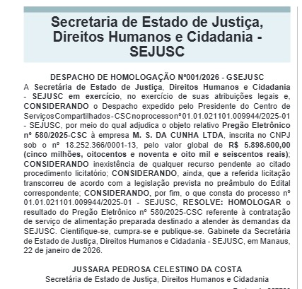 A Secretaria de Estado de Justiça, Direitos Humanos e Cidadania (Sejusc) homologou um contrato no valor de R$ 5.898.600,00 para a prestação de serviços de alimentação preparada, as famosas marmitas, conforme despacho administrativo publicado em 22 de janeiro. A pasta é comandada por Jussara Pedrosa Celestino da Costa, secretária nomeada pelo governador Wilson Lima (União Brasil).