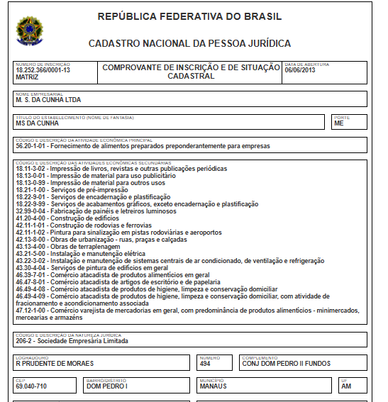 A empresa com a razão social M. S. da Cunha Ltda, tem o nome fantasia Ms da Cunha, opera com o CNPJ 18.252.366/0001-13 e foi fundada em 2013. O endereço de sua sede está localizada na Rua Prudente de Moraes, 494 – Dom Pedro I. Sua atividade principal é de Fornecimento de alimentos preparados preponderantemente para empresas.