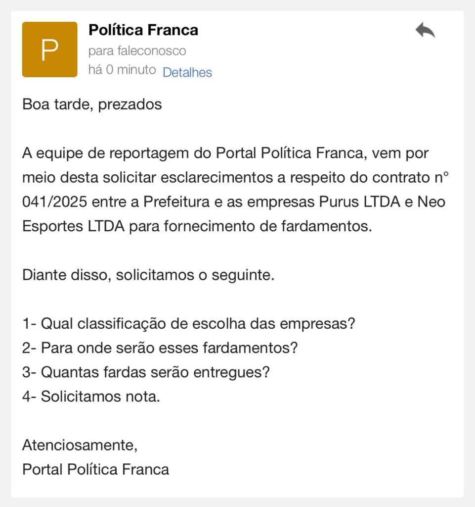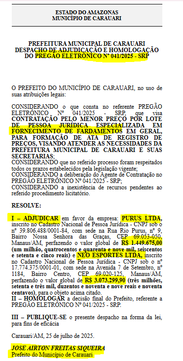 Também, o despacho de adjudicação e homologação n° 041/2025 o prefeito não deixa especificado sobre esse gasto, para onde será levado esses fardamentos, quantidade, se será para alunos ou funcionários municipais. A falta de informações coloca em dúvidas a gestão de Airton.