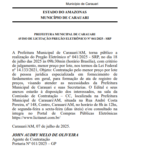 A equipe de reportagem do Política Franca, buscou por mais informações a respeito dessa licitação no Portal da Transparência de Carauari. Porém, o único documento encontrado foi um aviso de licitação com raras informações