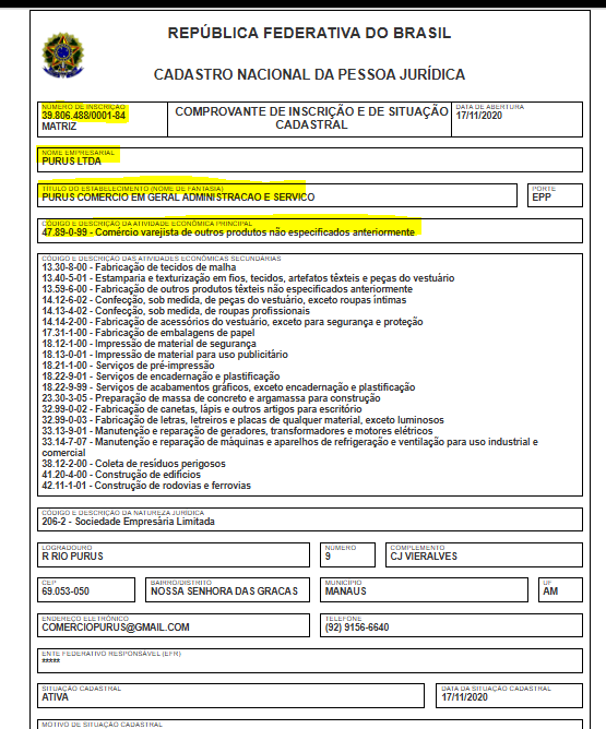 A empresa com a razão social Purus Ltda, tem o nome fantasia Purus Comercio em Geral Administracao e Servico, opera com o CNPJ 39.806.488/0001-84 e foi fundada em 2020. O endereço de sua sede está localizada na Rua Rio Purus, 9 – Nossa Senhora das Graças, Manaus. Sua atividade principal é de Comércio varejista de outros produtos não especificados anteriormente.