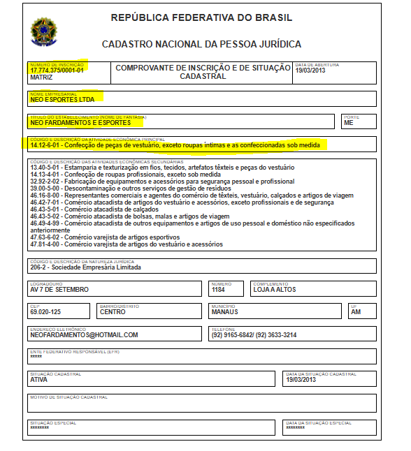 A segunda empresa contratada, Neo Esportes Ltda, tem o nome fantasia Neo Fardamentos e Esportes, opera com o CNPJ 17.774.375/0001-01 e foi fundada em 2013. O endereço de sua sede está localizada na Avenida 7 de Setembro, 1184 – Centro, Manaus. Sua atividade principal é de Confecção de peças do vestuário, exceto roupas íntimas e as confeccionadas sob medida.
