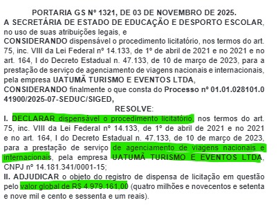 A secretária Arlete Mendonça, que comanda a Secretaria de Educação e Desporto Escolar (Seduc-AM), dispensou licitação e contratou a agência de viagens, Uatumã Turismo e Eventos Ltda, que tem sua sede localizada em Campina, São Paulo.