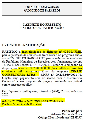 O prefeito de Barcelos, Radinho Alves (União Brasil) dispensou licitação e vai gastar R$ 2.280.000,00 dos cofres públicos com a empresa Innaie Consultoria Ltda, para produzir e veicular o programa institucional “Minutos Barcelos”.